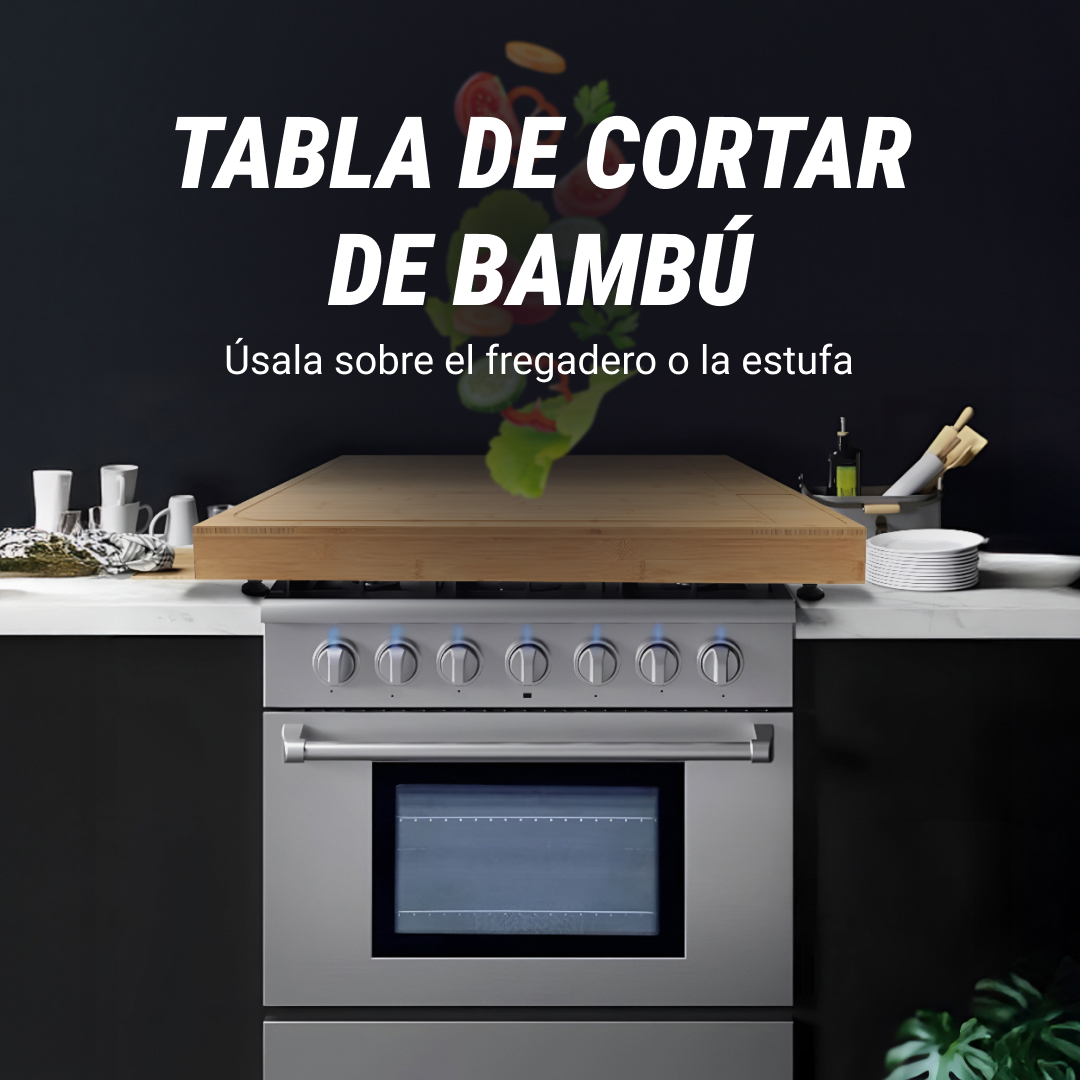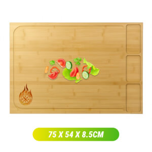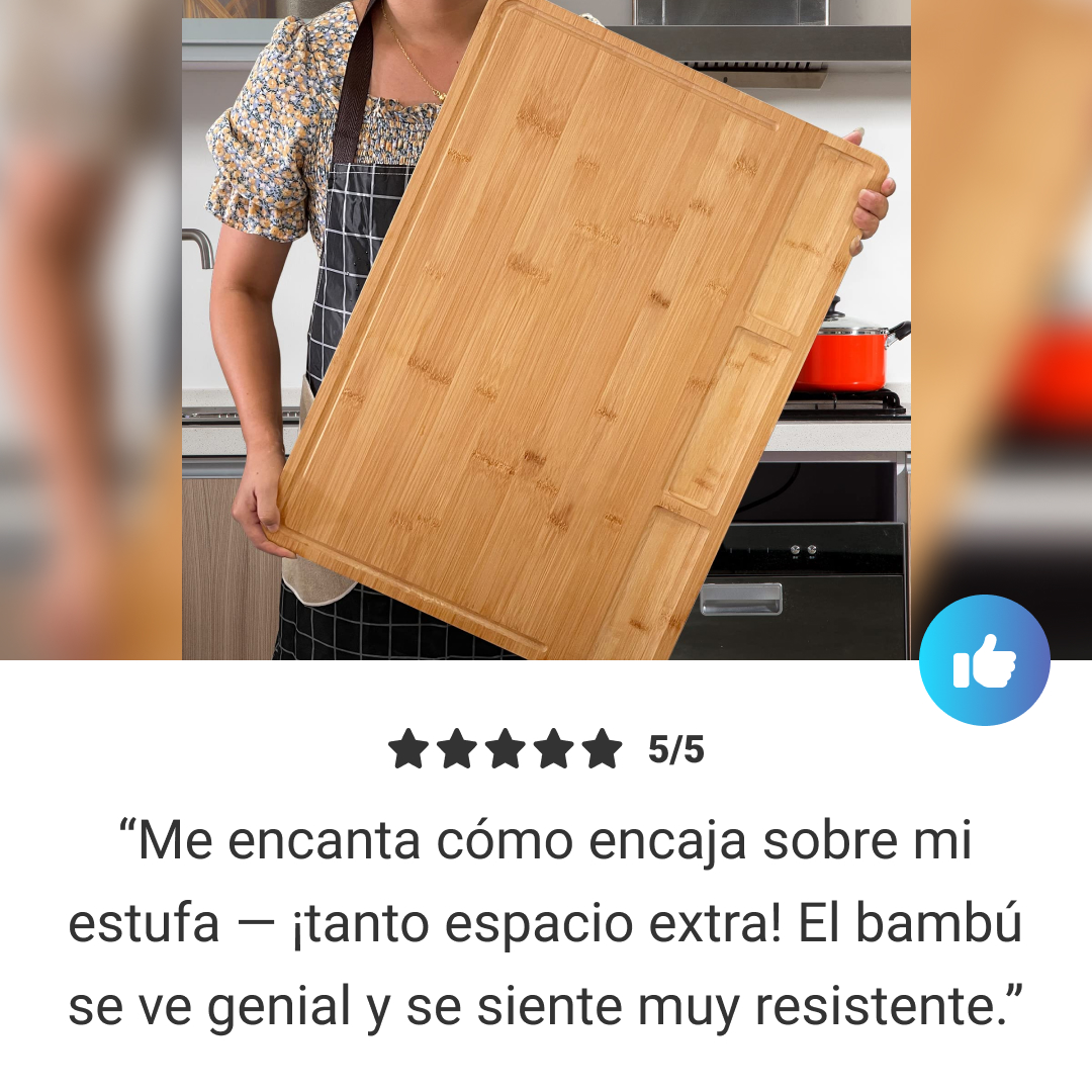 La tabla de cortar extra grande BambooCraft ofrece una superficie generosa de 75 x 54 x 8.5cm, diseñada para el uso tradicional y para ser colocada sobre fregaderos o estufas.
